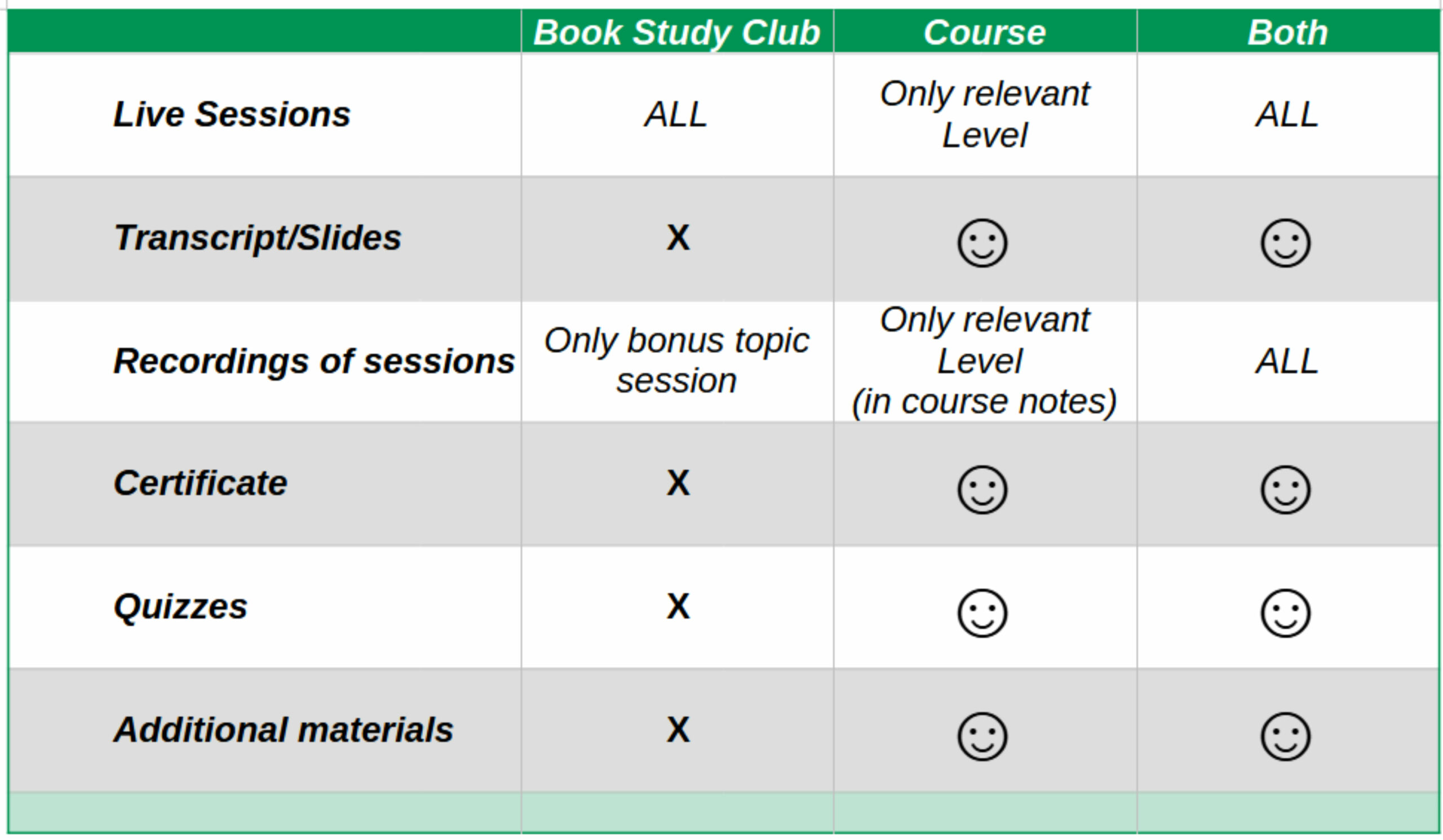 This runs alongside the Book Study Club live sessions, which double as a live Q&A for course participants (catering for those who only want the live sessions and do not want a course, as well as those who want a course with all the additional materials, resources and certificate that the course offers).